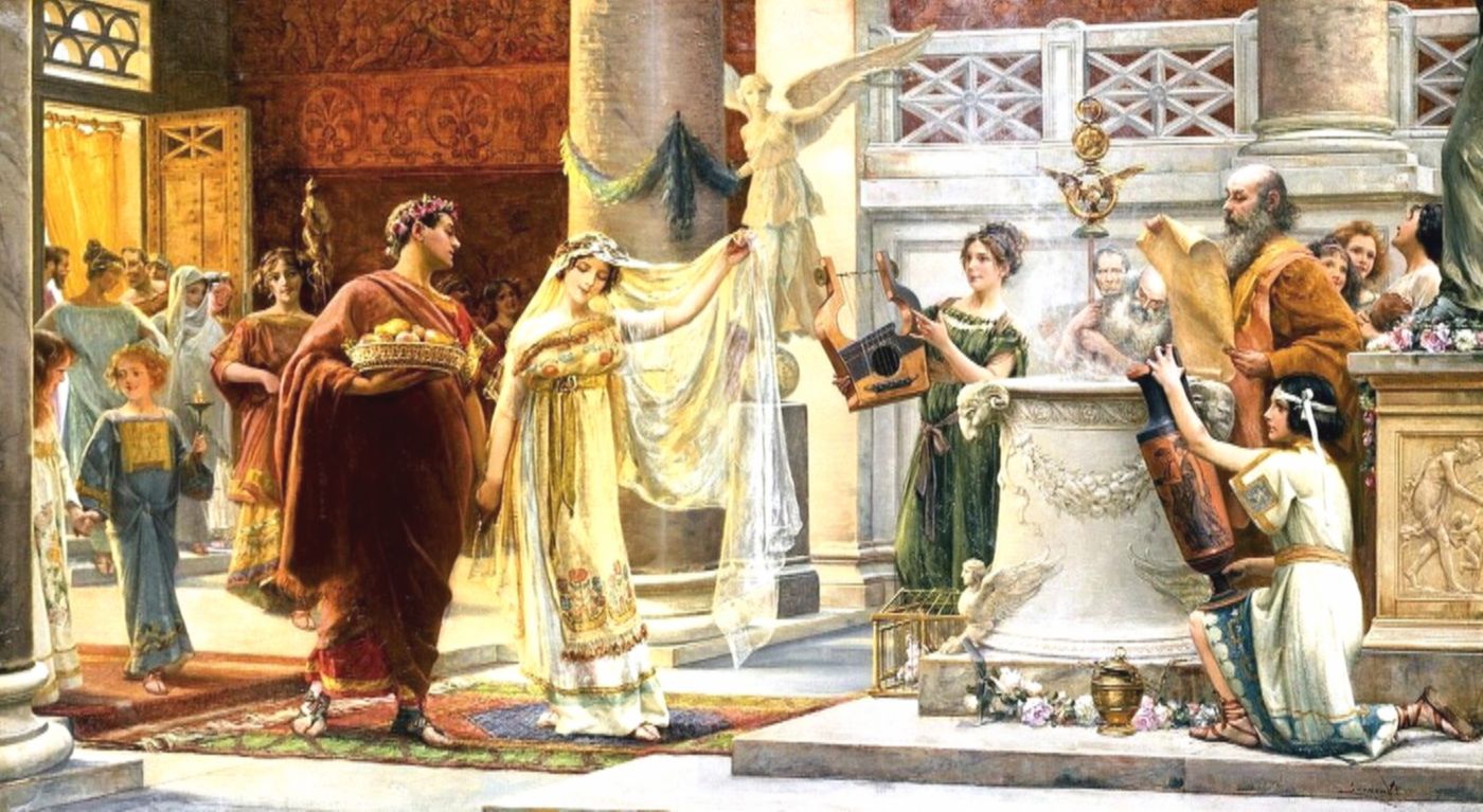 Невесту бросили на подушки, она сопротивлялась, скулила. Гости затыкали уши, отворачивались, делая вид, что не замечают происходящего. Император пожелал Корнелию Орестину и, пока ее жениха держали стражники.