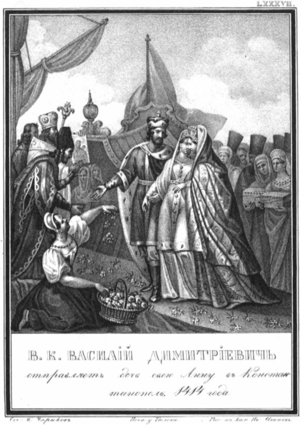 Он также побывал почетным заложником – в Орде, но бежал и нашел приют у Витовта. Литовский князь воспользовался удобным случаем и при помощи митрополита Киприана устроил его помолвку с дочкой. Никоновская летопись утверждает, что Витовт принудил Василия жениться на Софье: