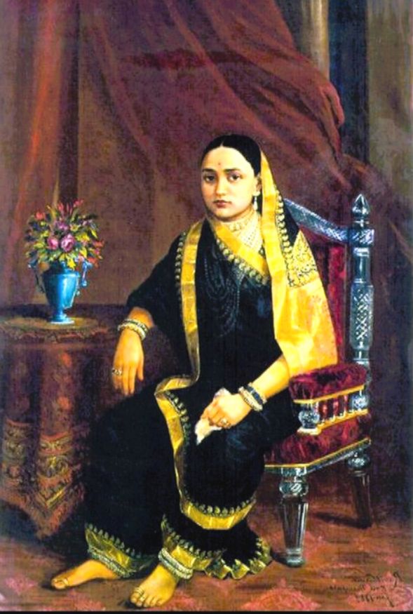 «Махарани среднего роста, но держит голову так гордо и в то же время так грациозно, что кажется выше, чем есть на самом деле. Ее тщательно ухоженные и пышные волосы скрыты сари из белого шелка с золотым отливом, которое ниспадает на идеальные очертания ее изысканной фигуры и собирается между колен, открывая лодыжки, украшенные жемчугом, и маленькие босые ступни, которые так же прекрасно ухожены, как и ее руки.