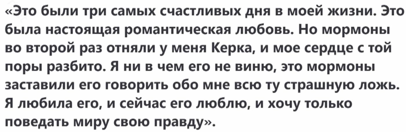 По словам Керка, Джойс «набросилась на него и мучила несколько часов». Для мормона случившееся стало ужасным шоком.