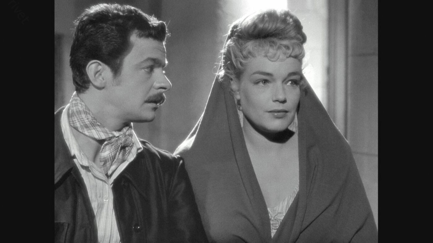 Посреди двора стоит молодая женщина. У нее необычайно светлые волосы и лукавая полуулыбка, как на картинах итальянских мастеров. Он знает, что женщину зовут Симона Синьоре, но он никогда не видел ее на экране.