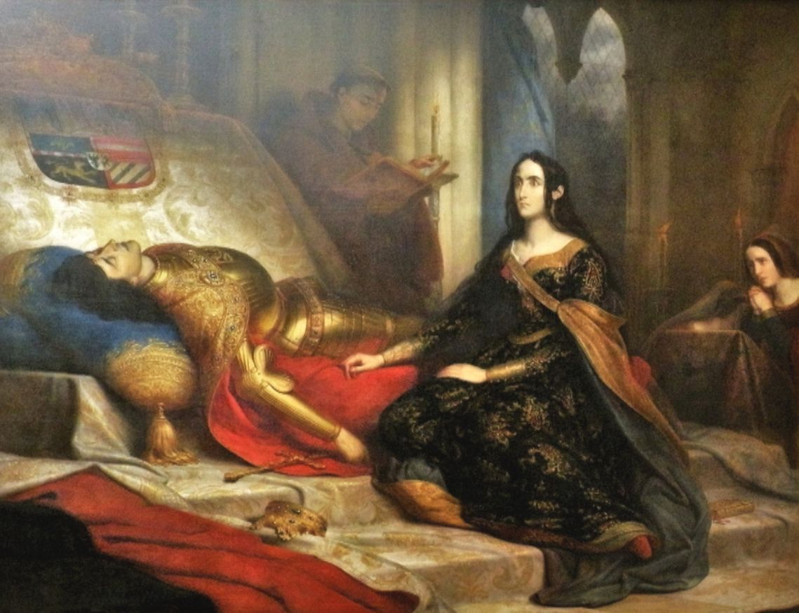 Она приказала открыть крышку гроба. Все отшатнулись в ужасе, но она видела не тлеющую плоть, а прекрасные черты своего любимого. Королева приказала всем женщинам выйти и не позволяла им заходить в комнату, целую ночь она провела рядом с мужем, целуя его ноги и оплакивая свое утраченное счастье.