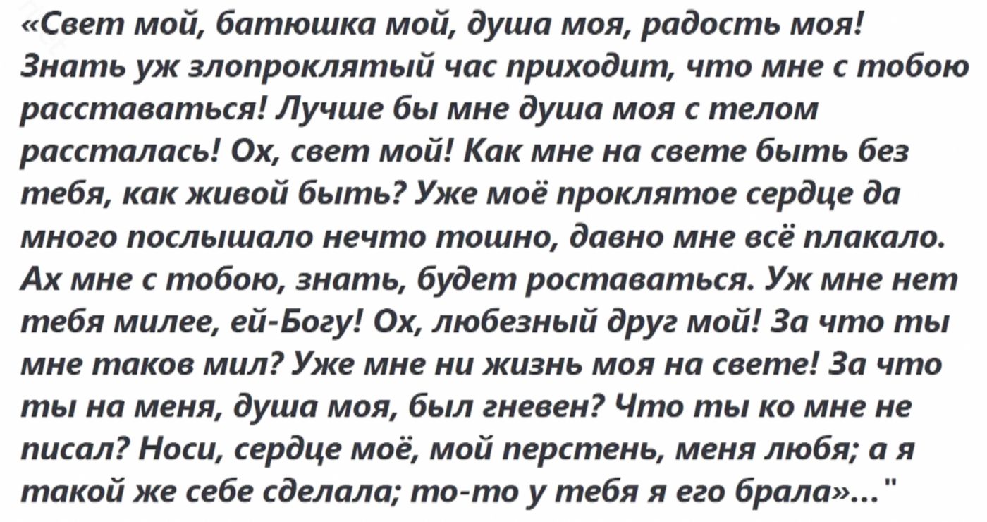 «Здравствуй, свет мой, на множество лет! Просим милости, пожалуй, государь, буди к нам, не замешкав. А я, при милости матушкиной, жива. Женишка твоя Дунька челом бьет».