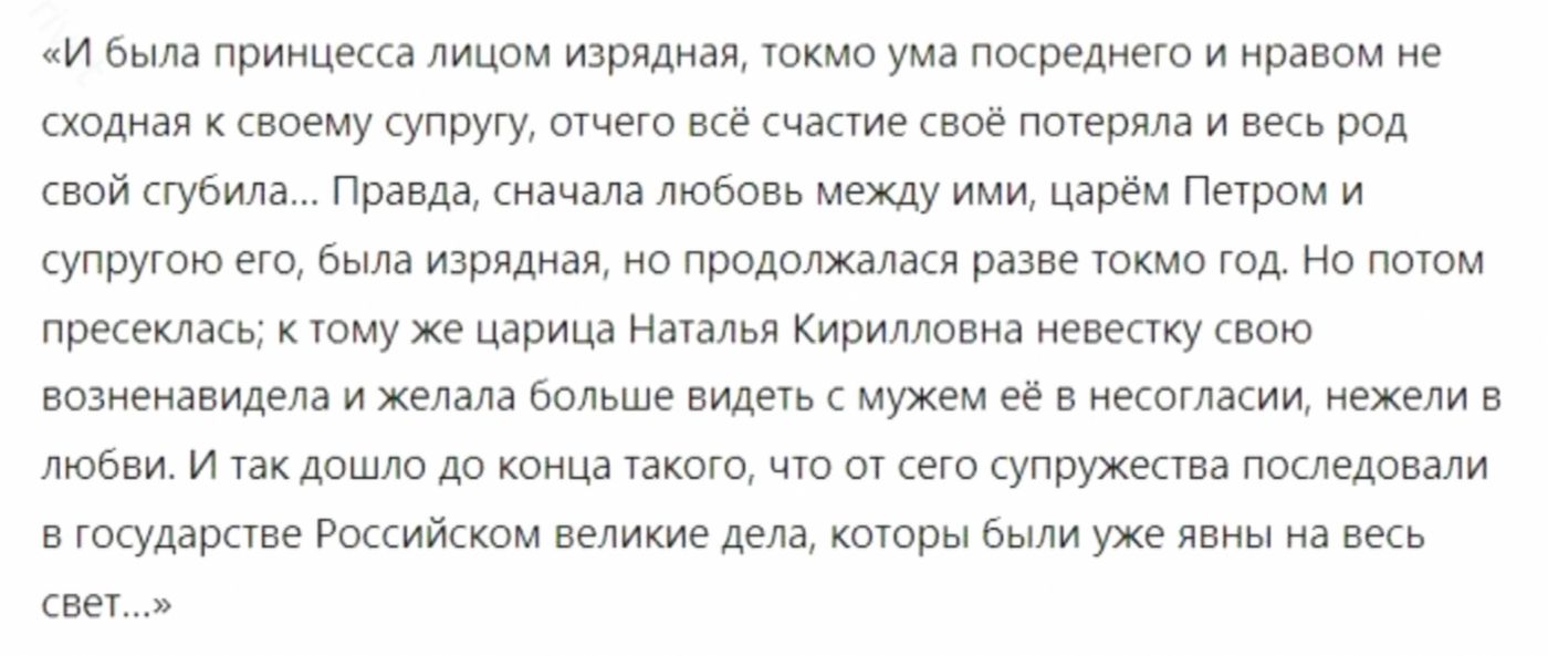 На момент бракосочетания Петру минуло семнадцать, Евдокии — двадцать. Однако в вопросах любовных царь был гораздо искушённее своей супруги, воспитанной по домостроевским канонам и ранее не покидавшей родного села.