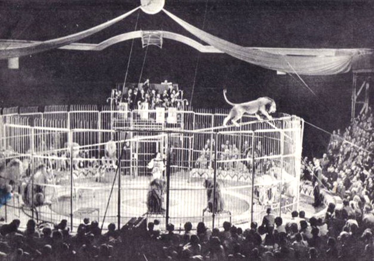 «Лев на мотоцикле» — царь зверей ездил на мотоцикле по манежу, управляемый невидимыми командами укротительницы.