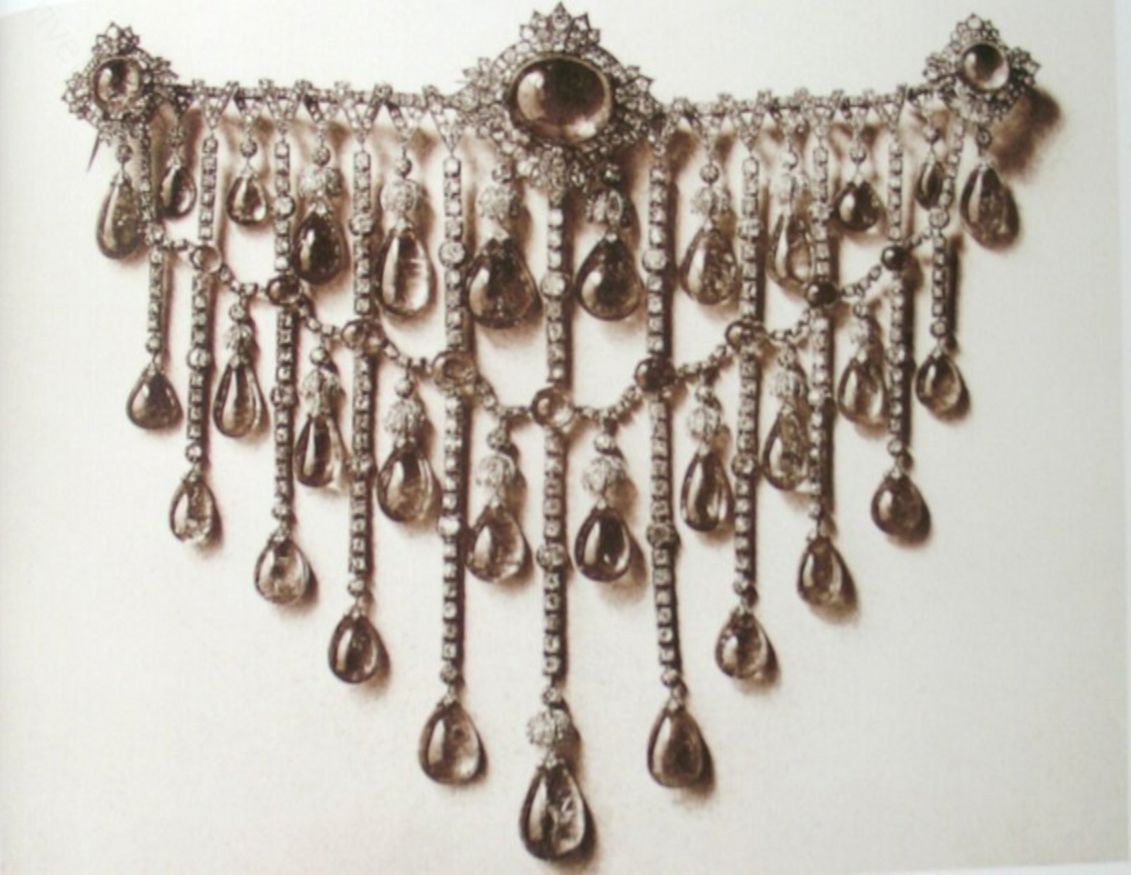 Это большое изумрудно-бриллиантовое devant de corsage представляет собой тройной каскад изумрудов-кабошонов грушевидной формы. Это поистине царское украшение стало свадебным подарком Елизавете Федоровне от княгини Зинаиды Ивановны Юсуповой.