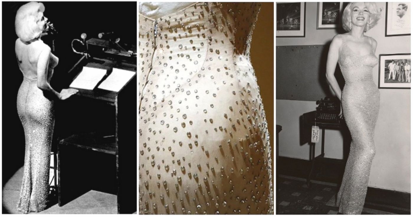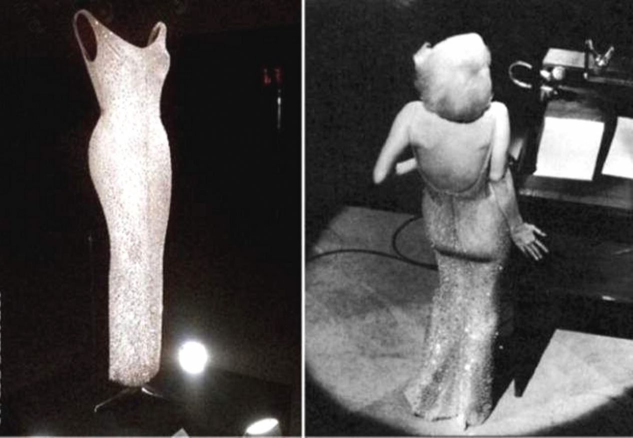 На Мэрилин было платье, которое дизайнер Жан Луи создавал как «вторую кожу». Расшитое 2500 (по другим данным — 6000) мерцающими стразами, оно было создано из маркизетовой ткани телесного цвета. Белья под нарядом не предусматривалось. Сама актриса называла его «кожей с бисером».