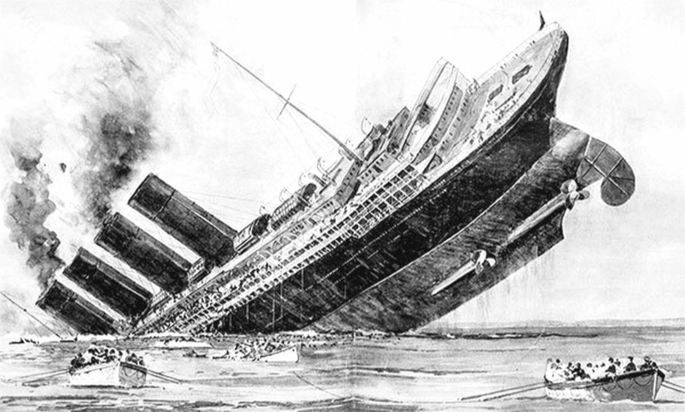 Несчастная «Лузитания» накренилась на пробитый правый борт и затонула в течение 18 минут в 13 километрах от берега.