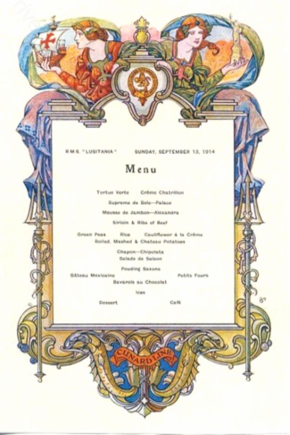Чтобы довести своих пассажиров сытыми и довольными, «Лузитания» перед каждым рейсом запасалась набором из 130 свиней, 40 волов, 10 телят, 80 овец, 60 ягнят, 150 индеек, 350 уток, 90 гусей, 200 фазанов, 400 голубей, а также около 4000 других различных птиц. И это только мясо, а еще ведь были крупы, масло и молоко, бесчисленное количество яиц и овощей.