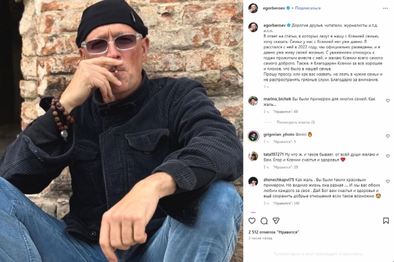 Напомню предысторию для тех, кто пропустил. В феврале Егор Бероев ошарашил публику постом: он объявил о расставании с Ксенией Алферовой и тут же, с разницей в полшага, женился на юной балерине.