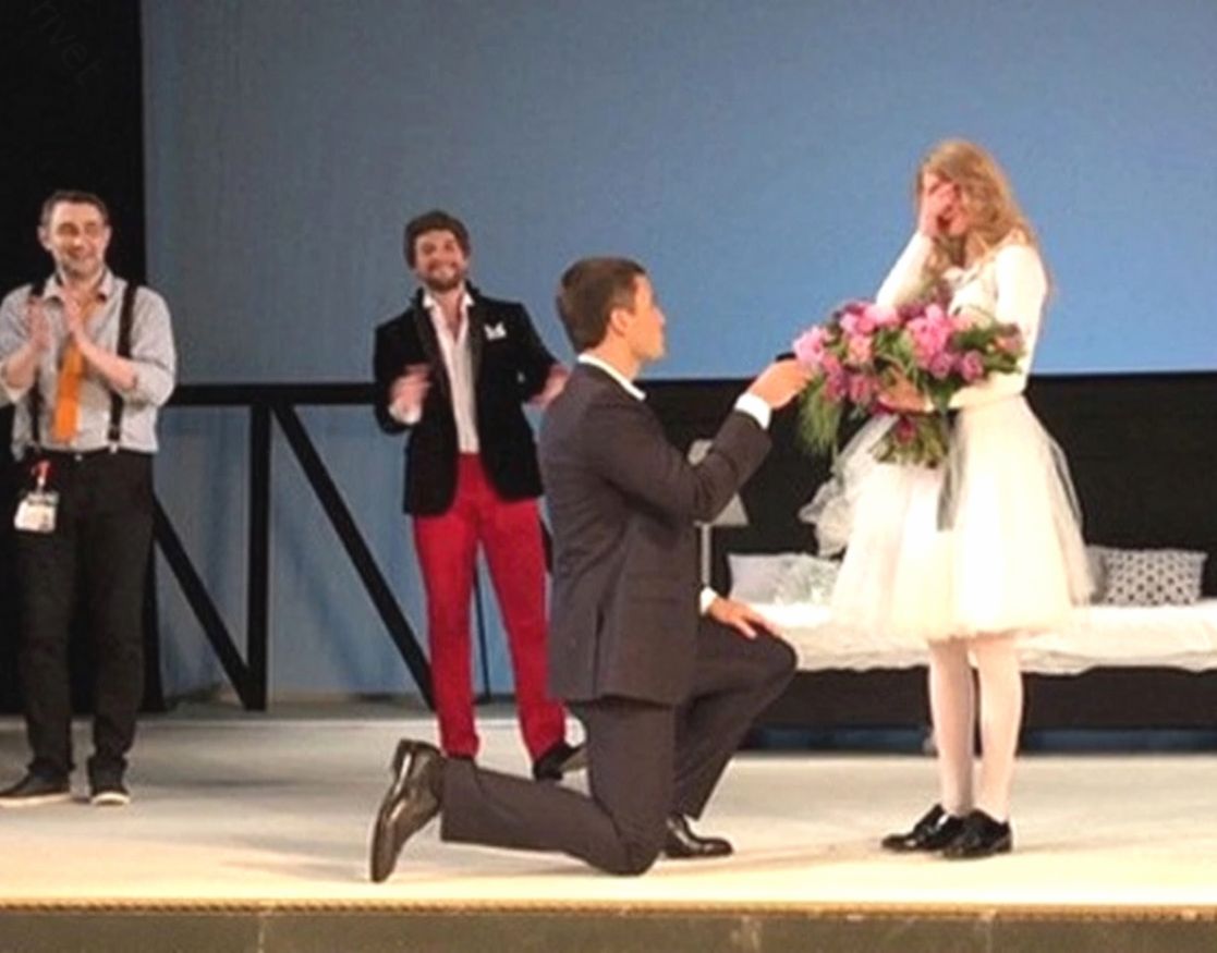Их отношения достигли пика романтики в мае 2015 года, когда после одного из спектаклей с участием Ходченковой Георгий поднялся на сцену и при полном зале зрителей, встав на одно колено, сделал актрисе предложение руки и сердца.