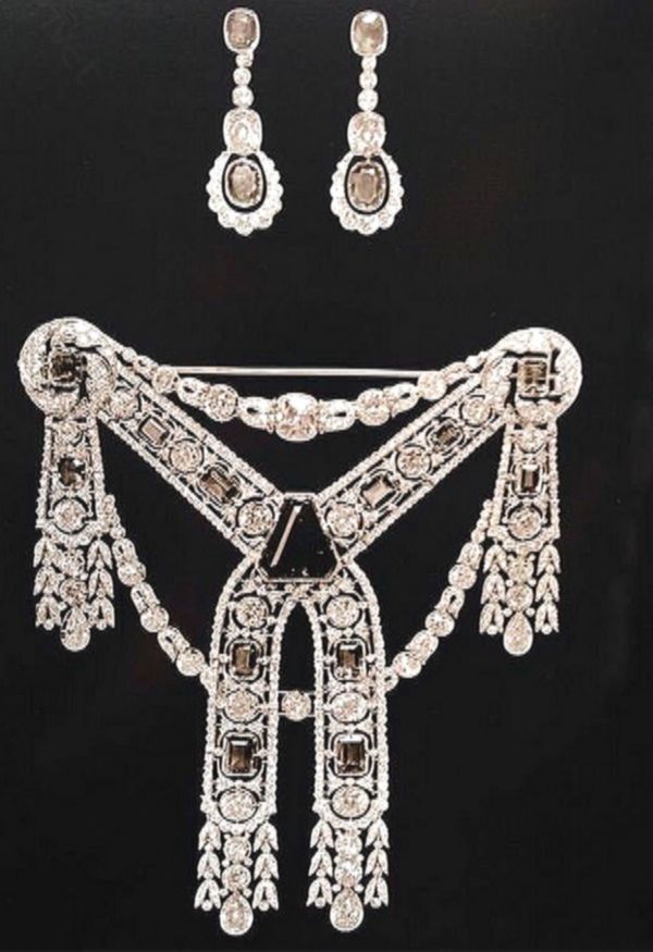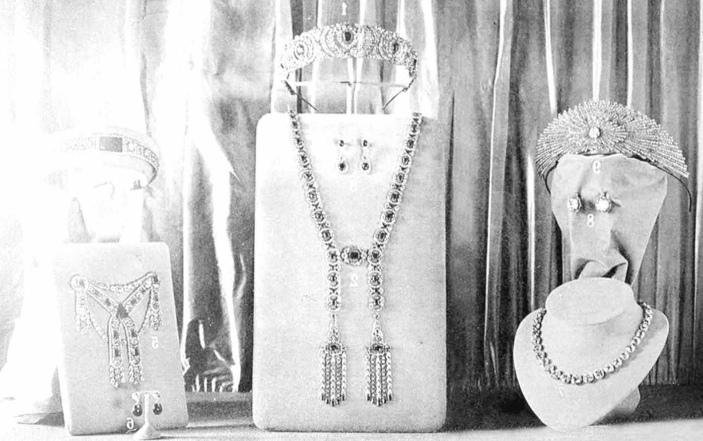 Наиболее эффектные драгоценности из московского клада можно было увидеть в 1925 году на выставке, посвященной той самой находке. Настоящим гвоздем экспозиции стали роскошное корсажное украшение и серьги с изумрудами — подарки Феликса Юсупова своей невесте Ирине к свадьбе.