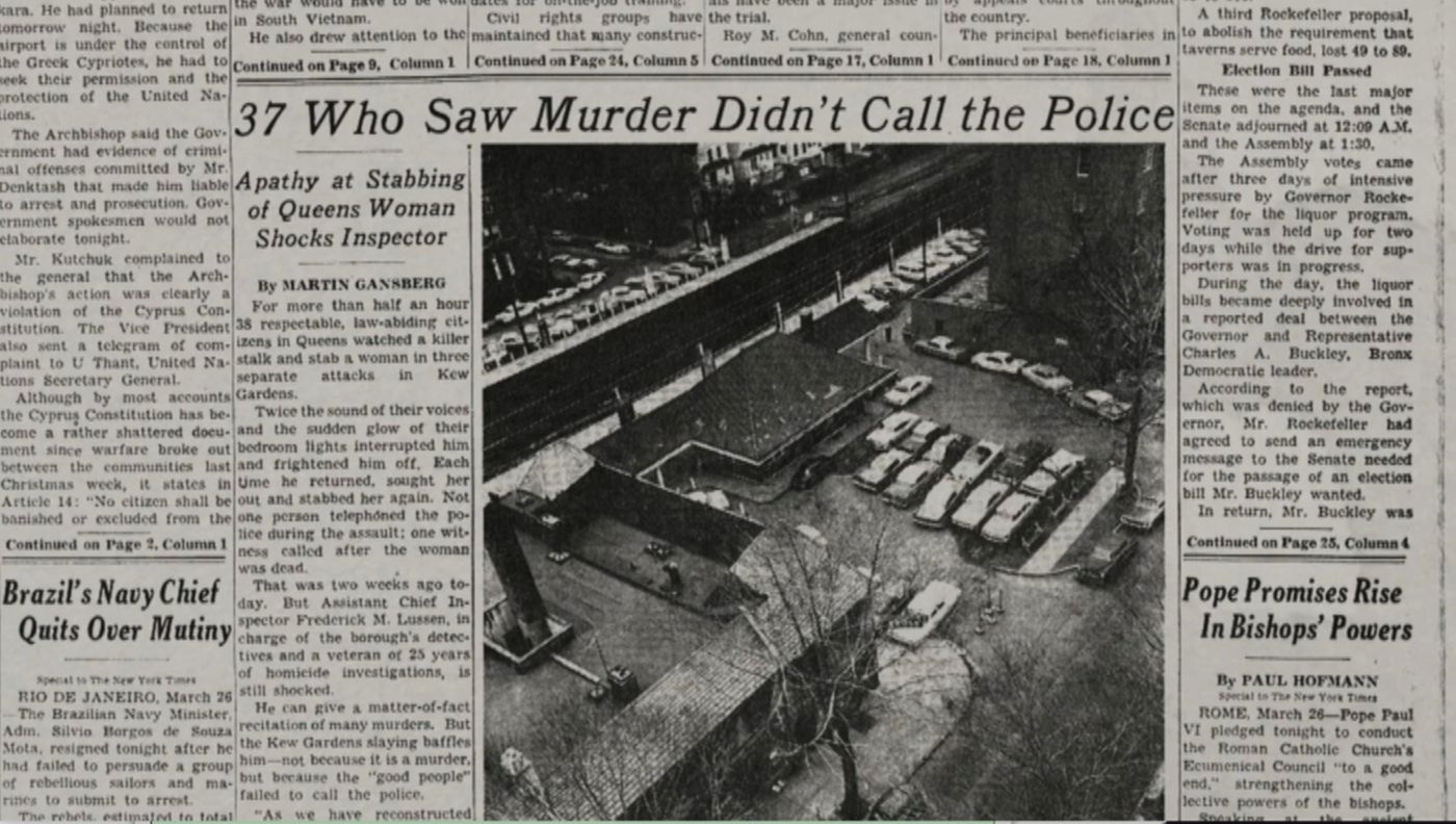 Освещение преступления, совершенного против Китти Дженовезе, изначально не вызвало шума. Однако две недели спустя в газете «Нью-Йорк Таймс» появилась статья под громким заголовком «37 человек, видевших убийство, не позвонили в полицию».