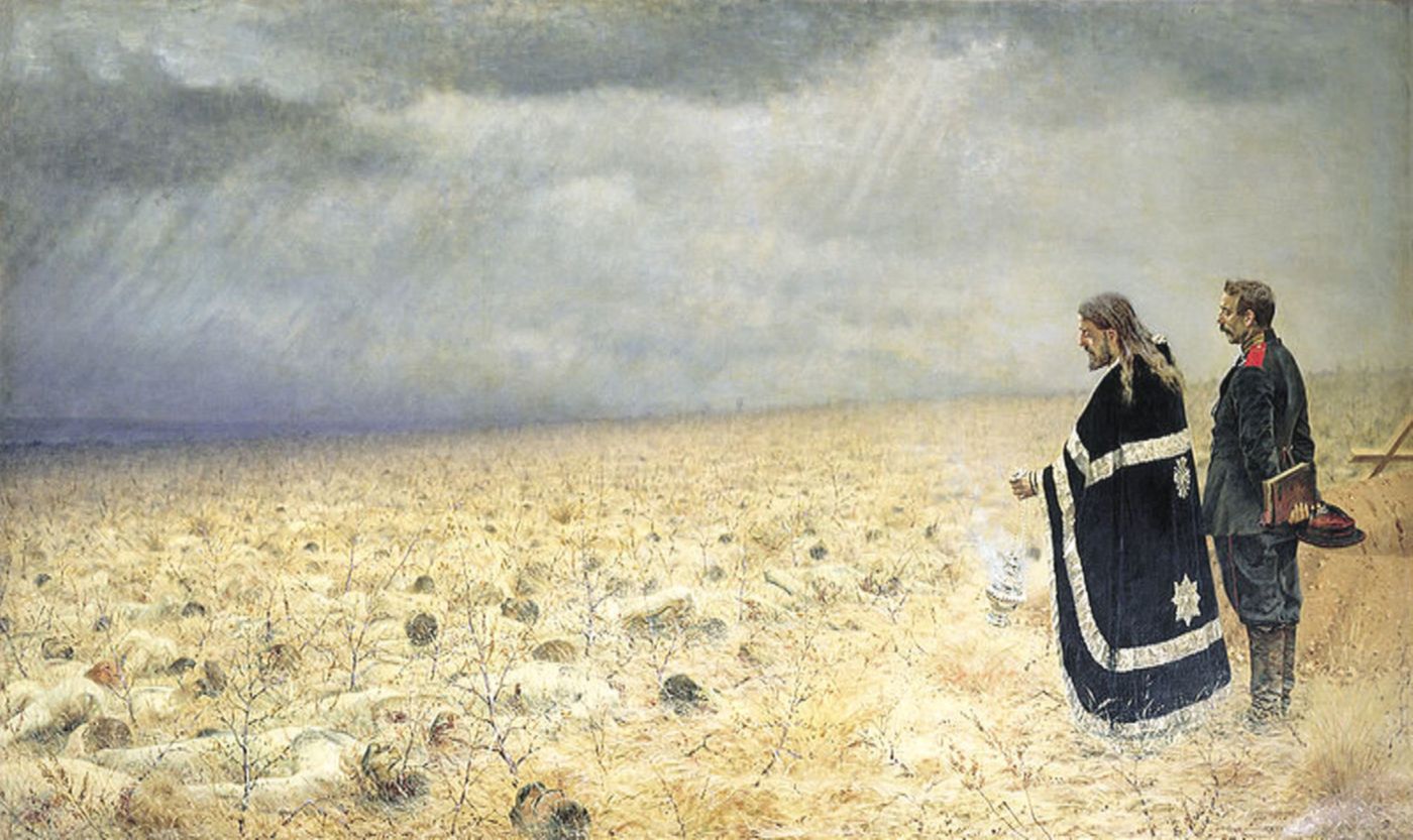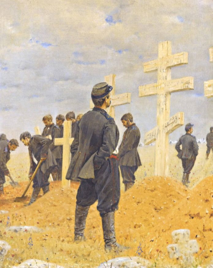 Картина под названием «Забытый» вызвала резкое осуждение императора Александра II. На ней изображено тело погибшего в бою русского солдата, которого оставили на поле битвы. Потрясенный картиной Мусоргский написал про забытого солдата балладу для фортепиано и голоса.
