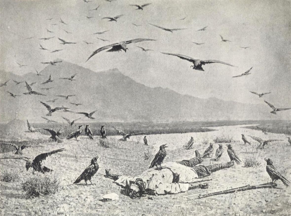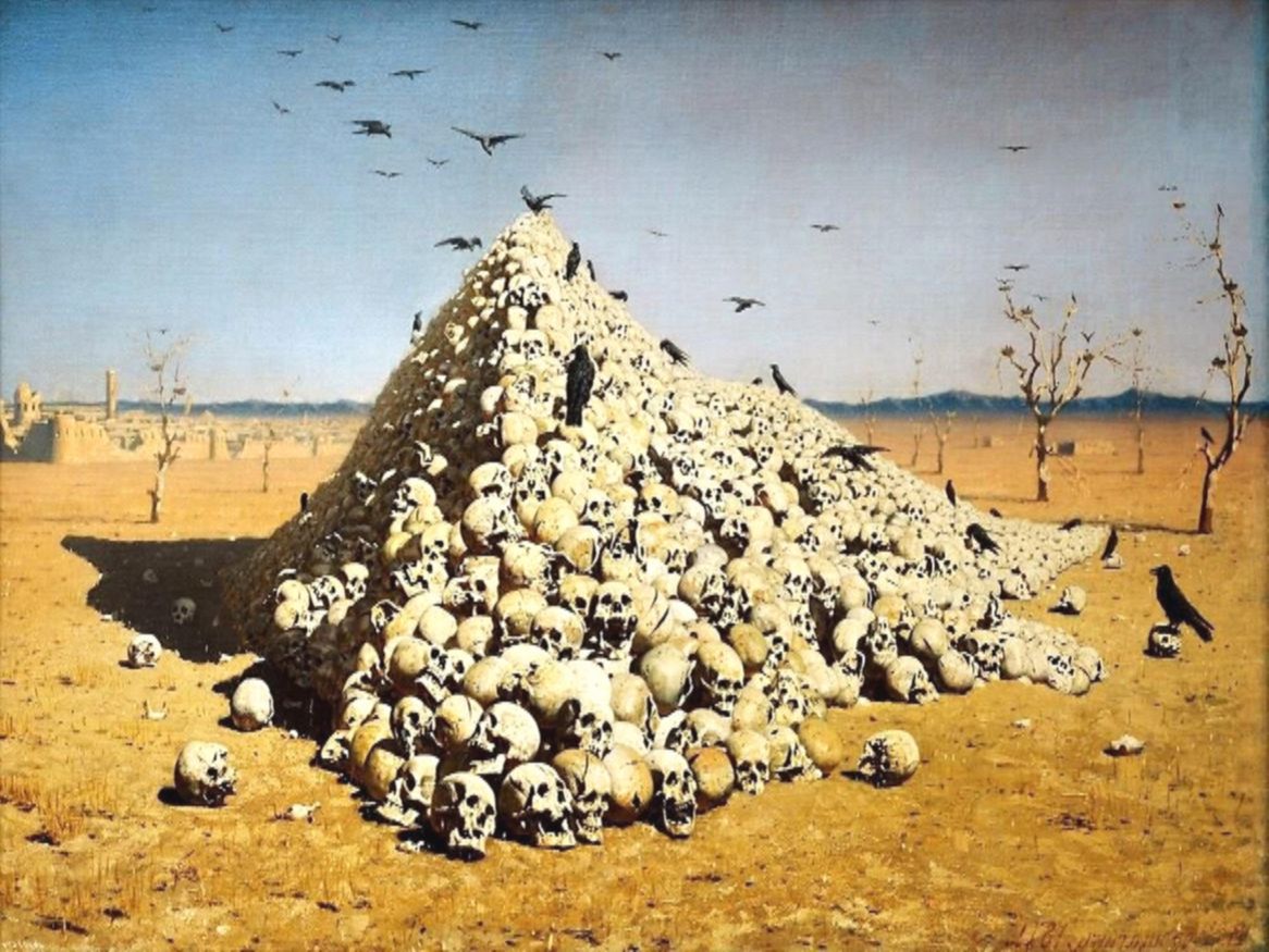 На одной из своих картин, названной «Апофеоз войны» (1871), художник изобразил пустыню, выжженную солнцем, желтые раскаленные пески, густую синеву неба и пирамиду черепов.