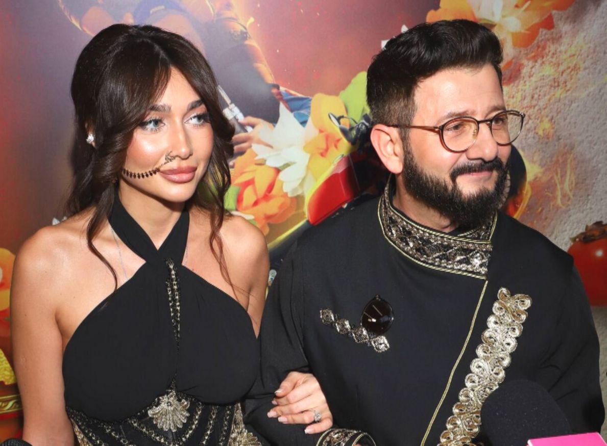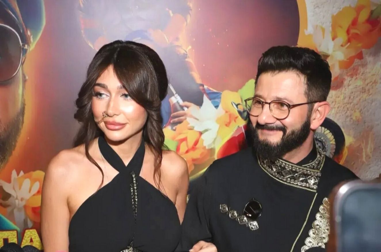 Влюбленные облачились в парные наряды. На Галустяне был черный костюм с золотыми вставками в индийском стиле. Его спутница надела черно-золотое платье в пол в духе Болливуда. Приталенный фасон наряда подчеркнул ее стройную фигуру.